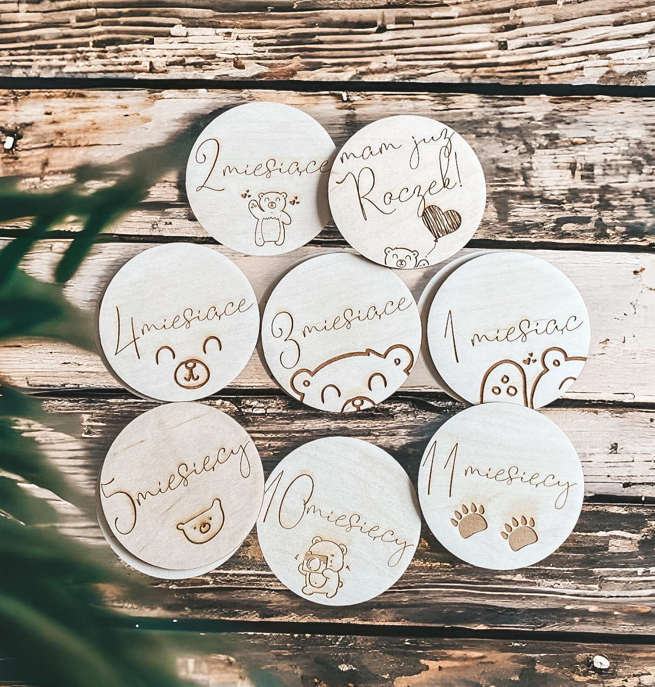 Krążki drewniane do zdjęć dziecka liczby miesiące ciąża tabliczki Misie